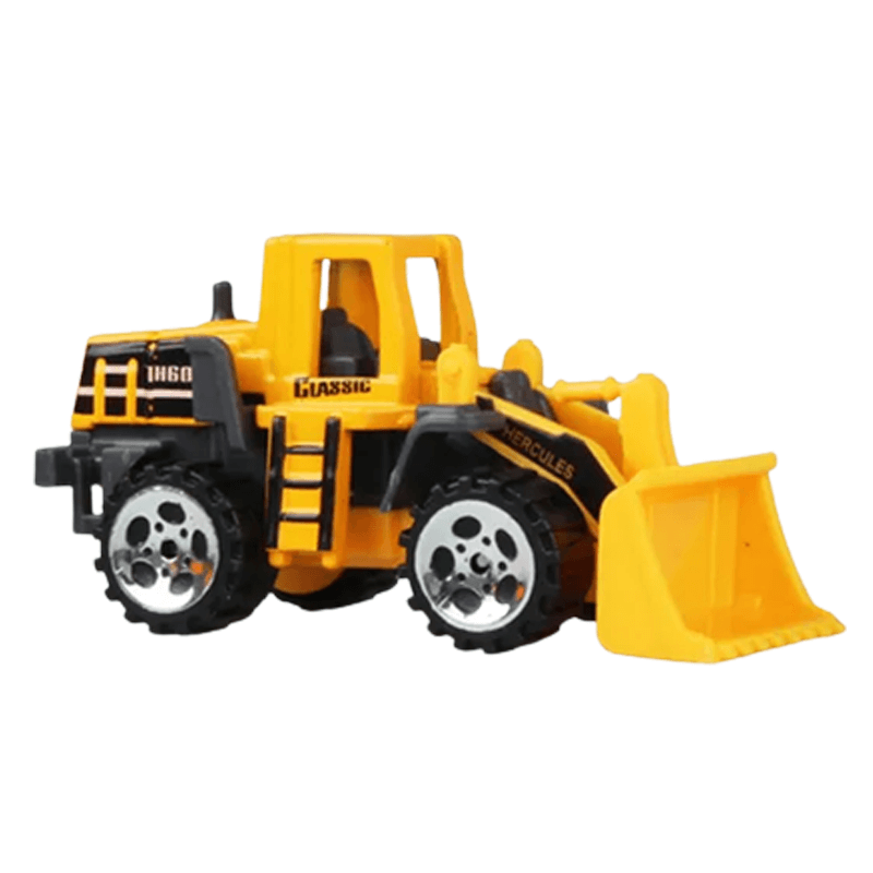 Bouwmodel maat Graafmachine 40x30x33 mm, Heftruck 72x26x40 mm, Betonmixer 79x30x45 mm, Kipper 77x30x35 mm, Wegenschaaf 70x36x35 mm, Bulldozer 73x32x40 mm