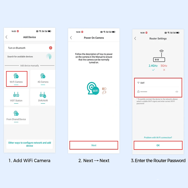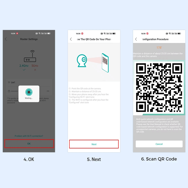 - Verbind de camera via de 2,4 GHz WiFi-netwerkband. Volg de 6 stappen in de afbeelding om verbinding te maken en u kunt de camera met succes configureren.