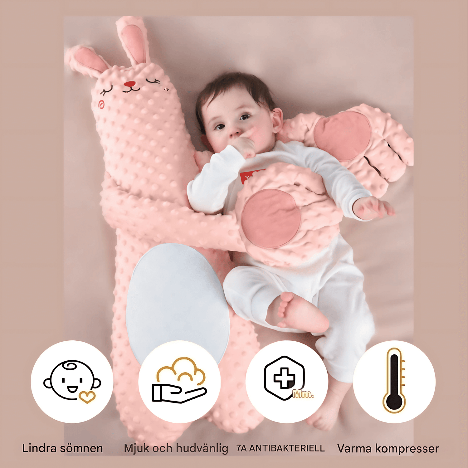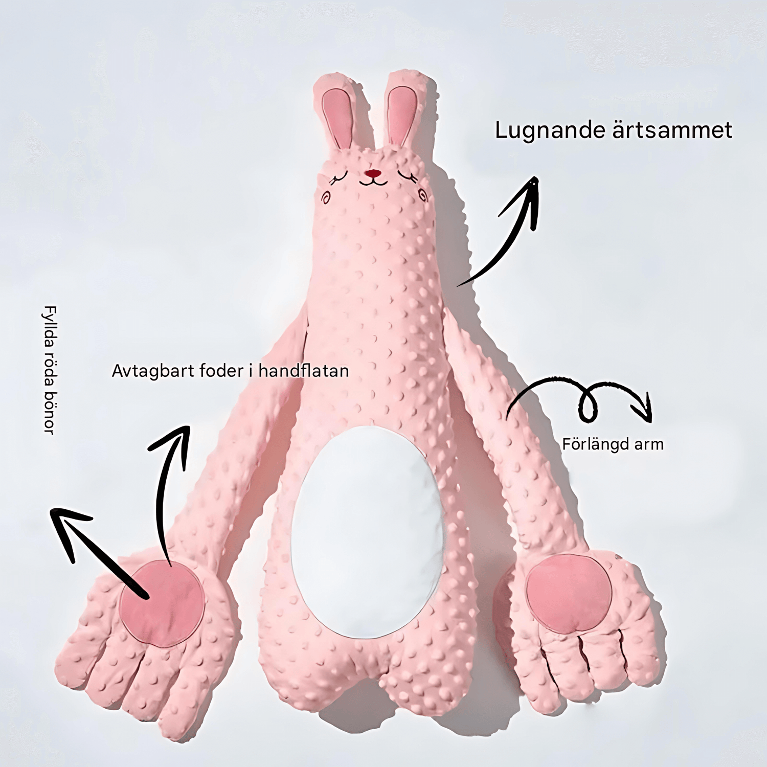 Den inbyggda röda bönkärnan kan hålla värme under längre tid och ge en mjuk, behaglig känsla mot barnets mage, vilket kan skapa en lugnande effekt och en mysig atmosfär.