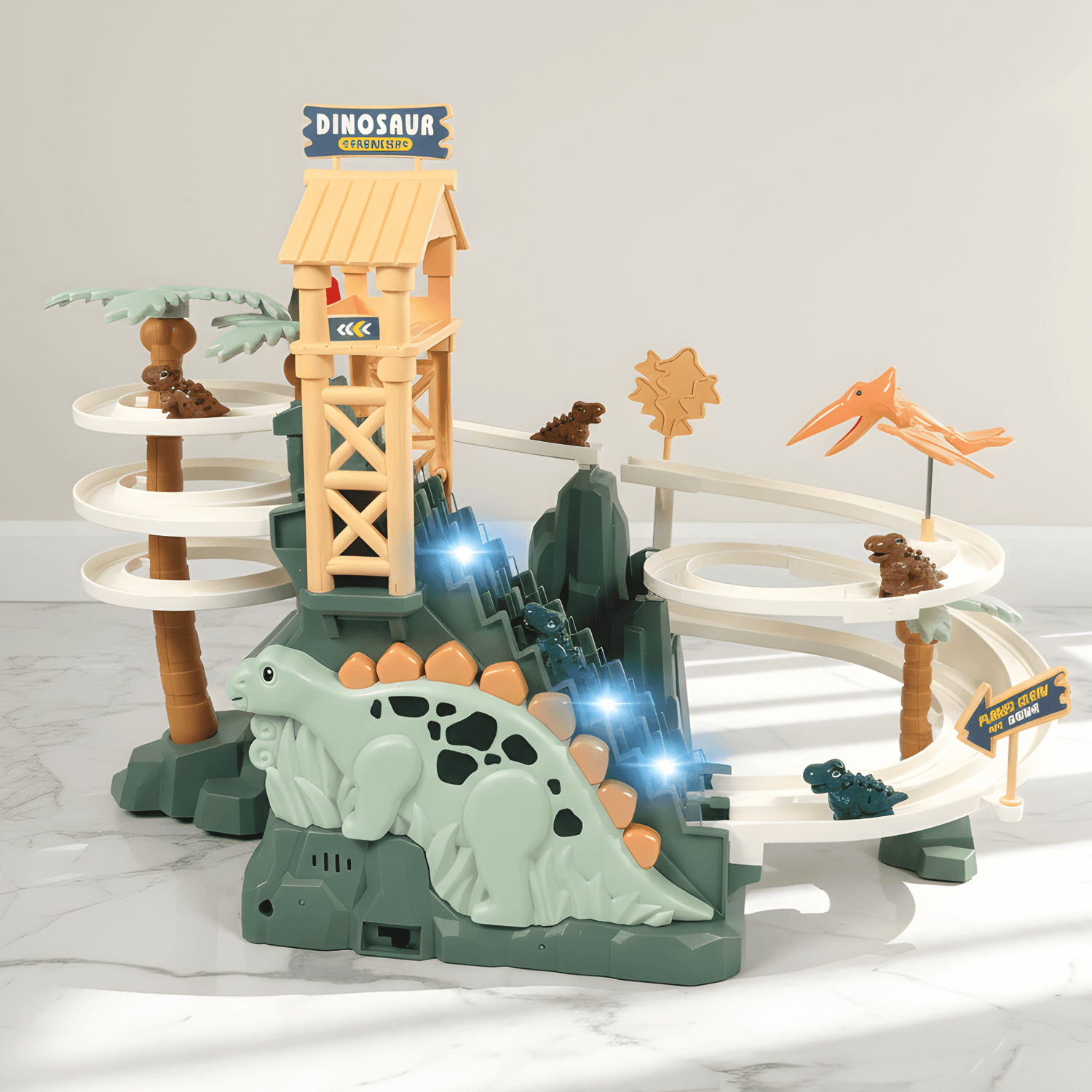 Med DinoTrack kan barn utforska en dubbelbanig rutschkana där små figurer kan klättra upp trappor och glida ner igen. Den dynamiska designen kan bidra till spännande lekstunder, och ljus- och musikeffekterna kan göra upplevelsen mer levande.