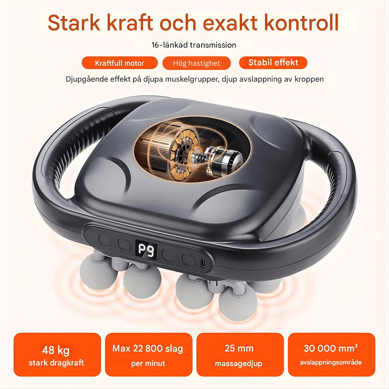 • 🎯 25 mm djupgående rörelse – kan bidra till att nå ner i de djupare muskellagren